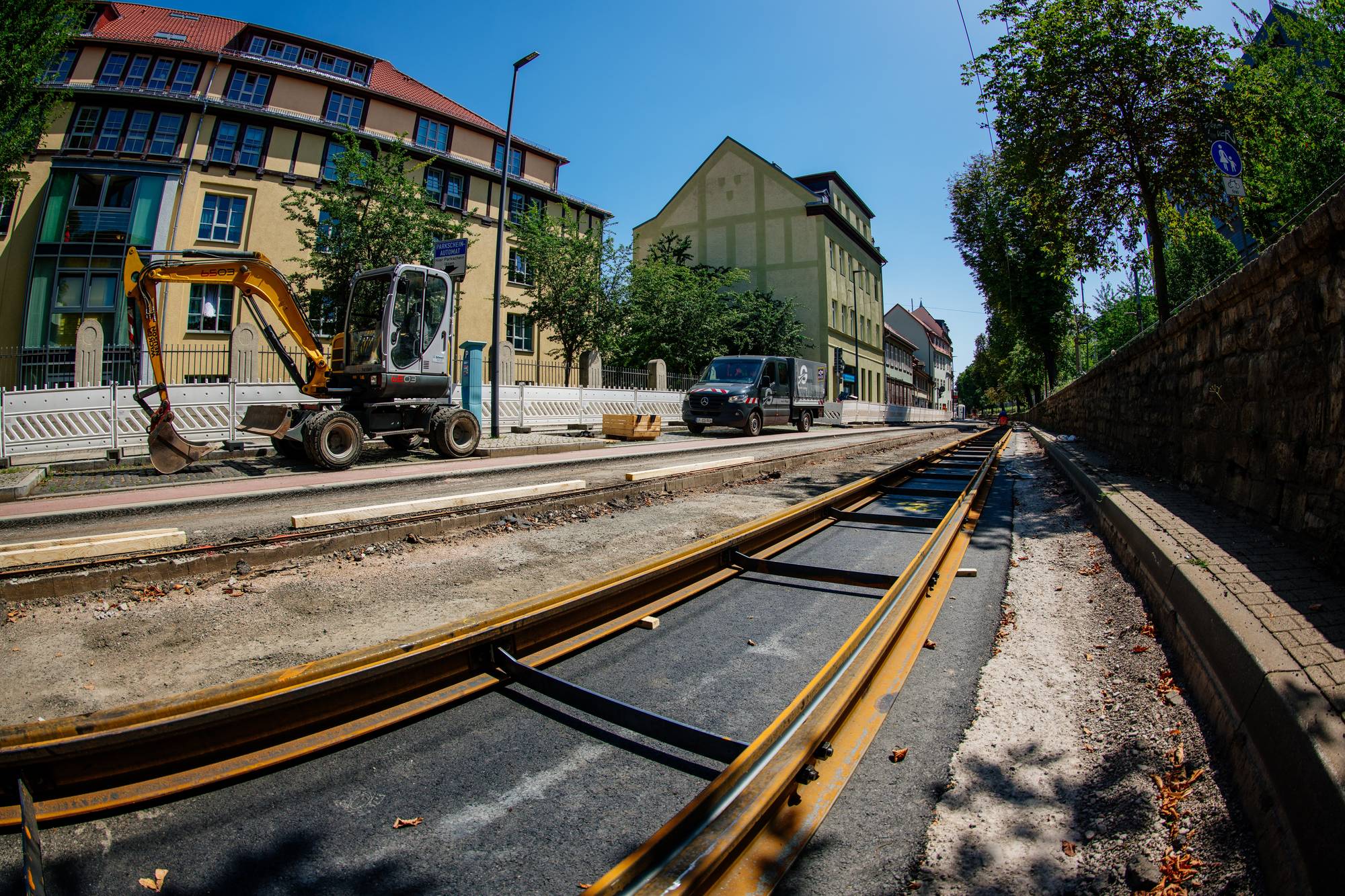 Der Plan: Ab dem 17. August sollte die Straße wieder für den Stadtbahnverkehr und Autos befahrbar sein. Trotz aller Bemühungen werden die Bauarbeiten nicht fristgerecht fertig, Grund sind verspätete Schienenlieferungen des Herstellers. Damit kann die EVAG erst am Mittwoch, 21. August, den regulären Linienbetrieb wieder aufnehmen. Ab 02:00 Uhr fahren dann die Stadtbahnen der Linien 3 und 6 wieder durch die Andreasstraße.