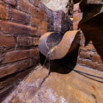 Kurz nach zehn haben die Pumpen ganze Arbeit geleistet. Der mit Natursteinen ausgekleidete Stollen ist weitestgehend trocken – also verhältnismäßig trocken. Nur im Becken ist noch Regenwasser, der Rest fand über Pumpen, Steigleitungen und eine steinerne Rinne im Außengelände des Wasserwerks seinen Weg aus der Sammelstube. Es kann also hinein gehen, in den dunklen, nur mit LED-Schlauchen ausgeleuchteten Berg.