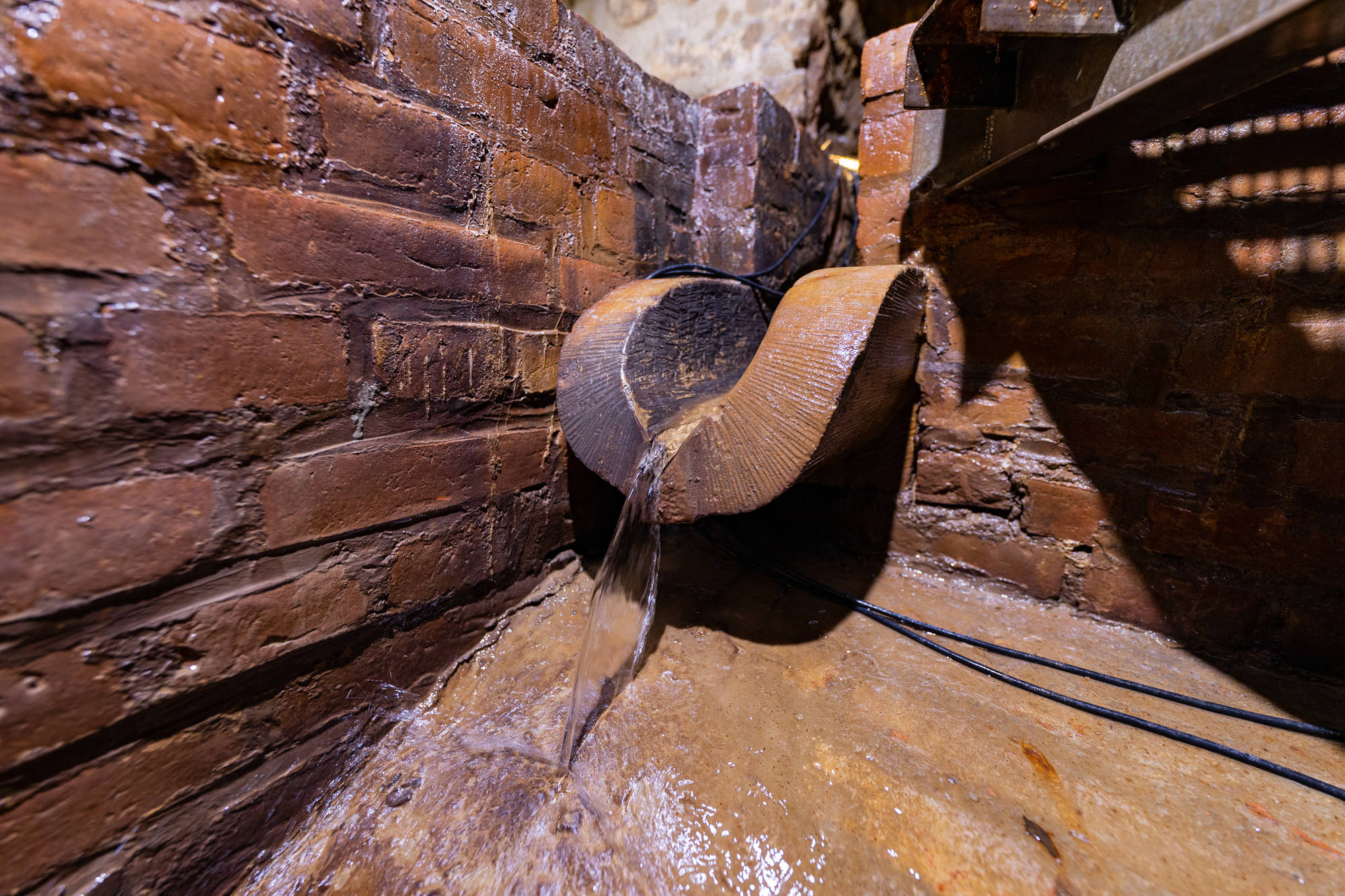 Es ist kurz nach halb neun, als Andreas Degelmann die schwarze Eisentür aufschließt. Ein Klick und das Licht geht an. Wenn er nun die Treppe hinunter müsste, stünde er bis zu den Knien im neun Grad kalten Wasser. Zum Glück lassen sich die Pumpen aber auch von oben einschalten, so dass Degelmann trockenen Fußes auf seine Gäste warten kann.