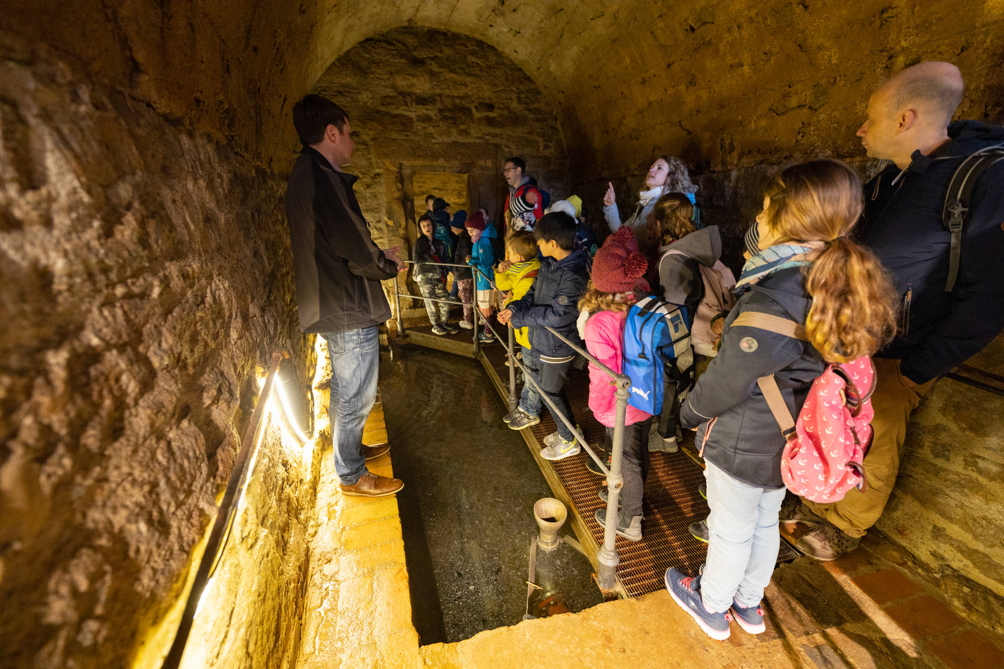 Die schwarzbraunen Bohlen aus Eichenholz sind rutschig, im Stollen ist es frisch. Die Kinder scheint es nicht zu stören. Begeistert laufen sie durch die engen Gänge, bewundern die hübschen, sandsteinfarbenen Quelltöpfe und hin und wieder ist ein „Buh“ zu hören. Immer dann, wenn sie einander erschrecken.