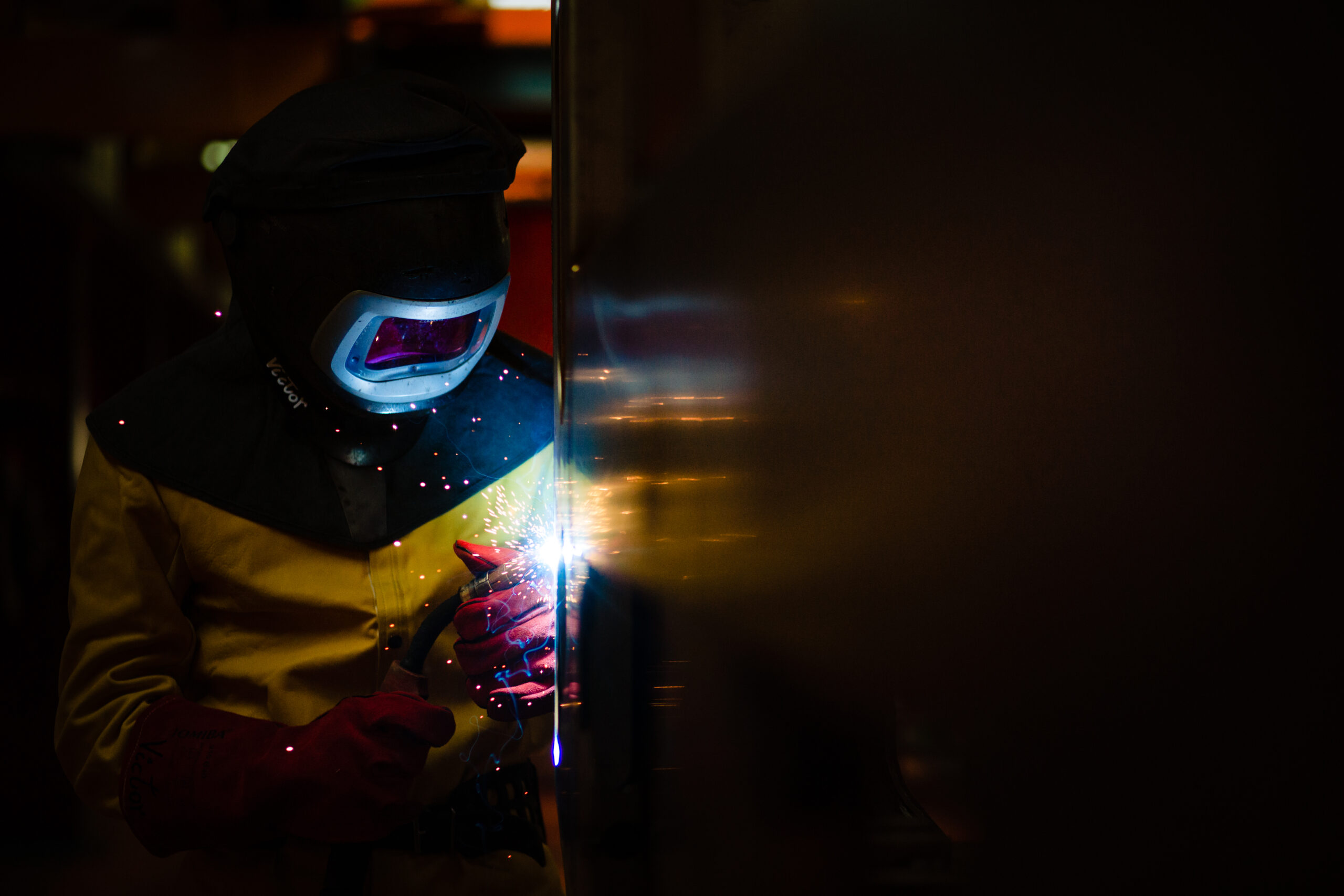 Ein Schweißer, geschützt durch schweren Helm und Spezialanzug, arbeitet an einem Stück Stahl, das blaue Licht, das von seinem Gerät ausgeht und das trotz der Hitze so kalt aussieht, spiegelt sich in seinem getönten Visier. Der leicht muffige Geruch von bearbeitetem Stahl, der ein wenig an den Geruch von Blut erinnert, wabert durch die Halle.