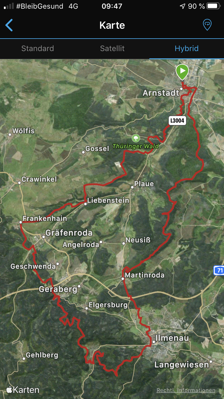 Die Familie ist dieses Jahr etwas geschrumpft. Die Strecke führte von Arnstadt über den Bach zu Goethe-Wanderweg nach Ilmenau, von dort über den Kickelhahn nach Manebach, weiter bis zur Hohen Warte und schlussendlich über Gräfenroda und Plaue zurück nach Arnstadt. Sehr familiär waren auch die beiden Verpflegungspunkte – die Eltern haben aufgetischt. Es gab Kuchen, Brühe, Äpfel, Bananen, Wasser und Cola. Für ein typisch Thüringer Gericht wie Rouladen, Rotkraut und Klößen ist hier keine Zeit, obwohl der Energieverbrauch auf der Strecke ungefähr 6 Portionen dieser deftigen Mahlzeit entsprechen würde. Aber ein mit Thüringer Köstlichkeiten gefüllter Magen ist da eher hinderlich. Die benötigte Energie nimmt Swen Thorhauer in der Regel 3 Stunden vor Beginn des Laufes mit einem großen Frühstück auf.