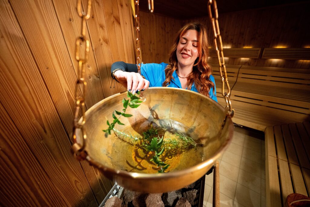 Im Sommer wurde so bereits ein Teil des Saunagartens zum Kräuterbeet umgestaltet. „Salbei, Thymian, Rosmarin oder Lavendel wachsen vor der Tür der Außensauna. Wir stellen daraus eigene Aufgussmittel oder Salzpeelings her. Kräutersäckchen dienen zum Abreiben, Pflanzensträuße sollen wohltuenden Duft in den Ruheräumen verbreiten. Melisse ist zum Beispiel anregend und liefert Energie, Lavendel beruhigt. Diese und andere Pflanzenkräfte wollen wir für ein noch sinnlicheres Saunaerlebnis nutzen“, plant Elisa Grein. Die Anwendungszwecke der Pflanzen des neuen Kräutergartens sind vielfältig: ätherische Öle für Massagen, Tees oder Limonaden – alles 100 Prozent natürlich. Als richtige Kräuterfee möchte Elisa Grein künftig ihr Wissen aus dem Reich der Pflanzen gern auch an die Saunagäste weitergeben.