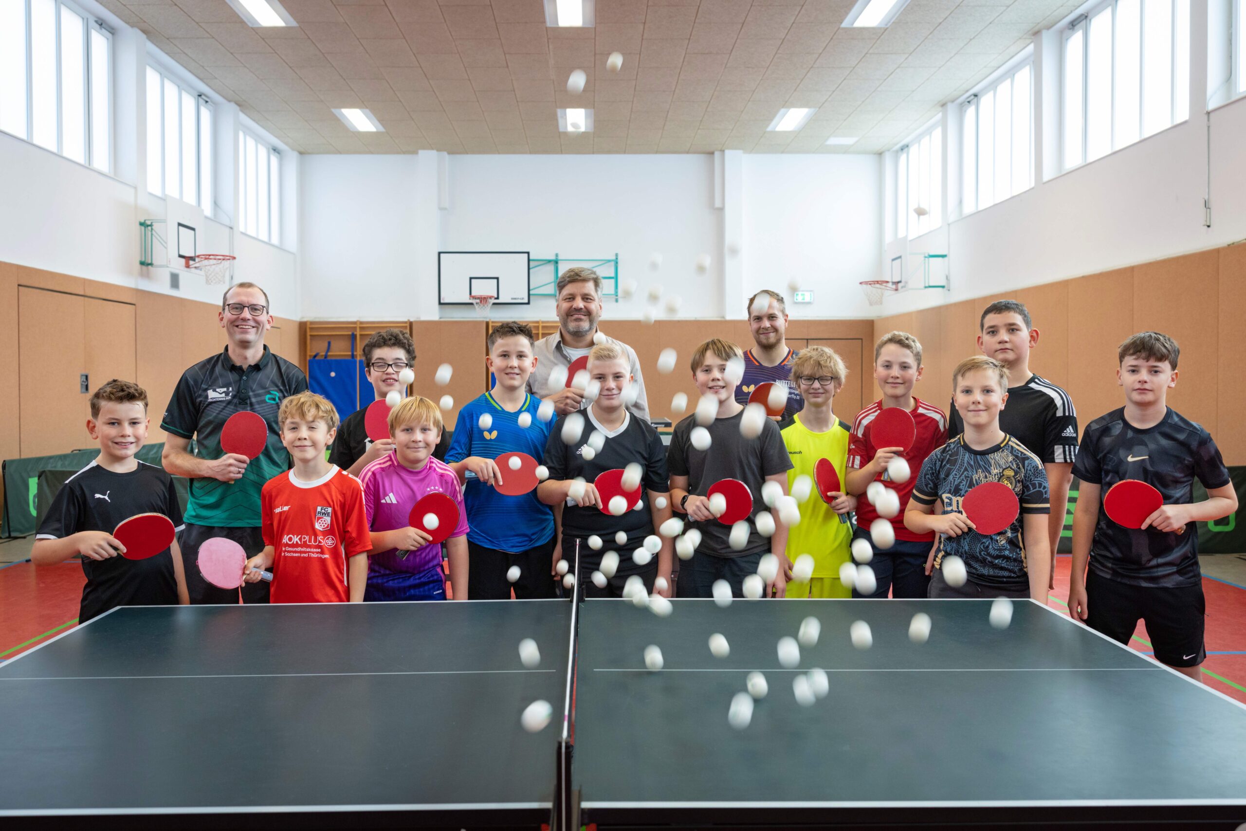 16 Tischtennisspieler sind ganz neu im Bereich der Jugend gestartet und trainieren seit August 2025. „Schon nach kurzer Zeit war die Nachfrage für das neue Jugendteam so groß, dass viele erst einmal auf der Warteliste landeten“, erzählt Daniel Willer (Bild oben rechts), neben Marius Marth einer von zwei neuen Jugendtrainern bei der Eintracht. „Unser Verein wurde in der jetzigen Form als TTV Eintracht Erfurt 1994 gegründet. Der Tischtennissport wird in der Turnhalle der Grundschule 22 in der Riethstraße aber schon über 40 Jahre betrieben. Mit aktuell fünf Herren- sowie einer Jugendmannschaft zählen wir zu den größeren Tischtennisvereinen Erfurts“, so Stephan Münkner, Vereinsvorsitzender. Nachdem die Jugendmannschaft vor ca. drei Jahren aus dem Verein abgewandert war und es an Trainern fehlte, ist der Start des neuen Nachwuchsteams ein großer Erfolg. Beide Jugendtrainer haben selbst als Jugendliche bei der Eintracht das Einmaleins des Tischtennisspieles gelernt. Daniel Willer ist nach mehreren Jahren Pause wieder in den TTV zurückgekehrt. Beide Söhne sind im neu gegründeten Team und so ist Trainingszeit auch Familienzeit. Die Sonderaktion zum Weltkindertag auf der Erfurt-Crowd kam zum richtigen Zeitpunkt. Daniel Willers Frau Sabine hatte davon gelesen. Zu der Chance auf eine ordentliche Spendensumme gab es für die ersten fünf Starter einen Trikotsatz für den Verein. Genau das fehlte dem Tischtennisnachwuchs noch, denn die Jugendabteilung ist ganz neu entstanden und erhielt erst zwei Wochen vor Ende der Sommerferien die Zusage für Hallenzeiten.