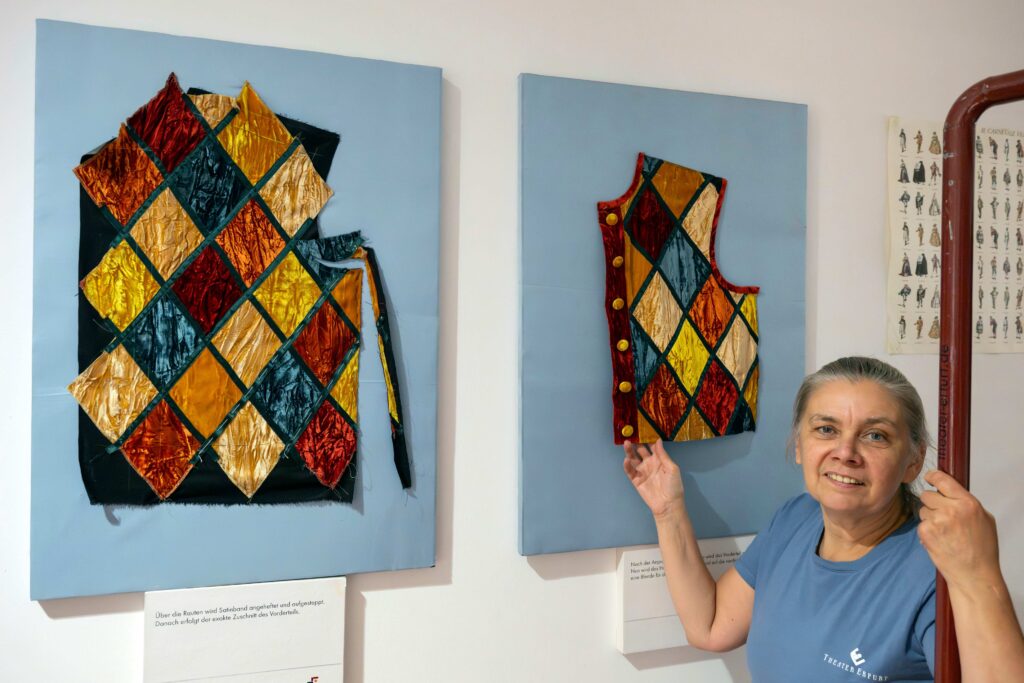 Schon auf dem Flur begrüßen Textilien in allen möglichen Variationen den Gast der Theaterschneiderei. Abendkleider hängen neben Anzügen, Damenröcke neben Herrenwesten. „Das sind die Kostüme der DomStufen-Festspiele. Die gehen jetzt in den Fundus“, sagt Susanne Ahrens. Die Herrengewandmeisterin schiebt einen der rollbaren Kleiderständer zur Seite. Dahinter hängt gerahmt die Weste eines Harlekins an der Wand. Er besteht aus vielen aneinandergereihten Karos aus buntem Stoff. Das Stück zeige, wie aufwendig manches Kostüm hier im Haus gearbeitet werde, sagt Ahrens. Theaterschneiderei ist weit mehr als nur Größen ändern oder gerissene Nähte flicken.