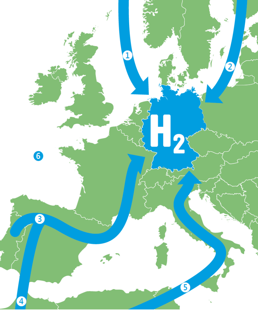 Direkt vor der deutschen Küste entsteht eines der größten Wasserstoffprojekte Europas. Ab 2030 sollen riesige Windparks in der Nordsee zur Herstellung von Wasserstoff – mittels sogenannter Elektrolyseure – auf dem Meer genutzt werden. Per Rohrleitungssystem (Nordsee-Korridor) kommt der Wasserstoff nach Deutschland. Geplante Kapazität: bis zu 1 Million Tonnen pro Jahr.