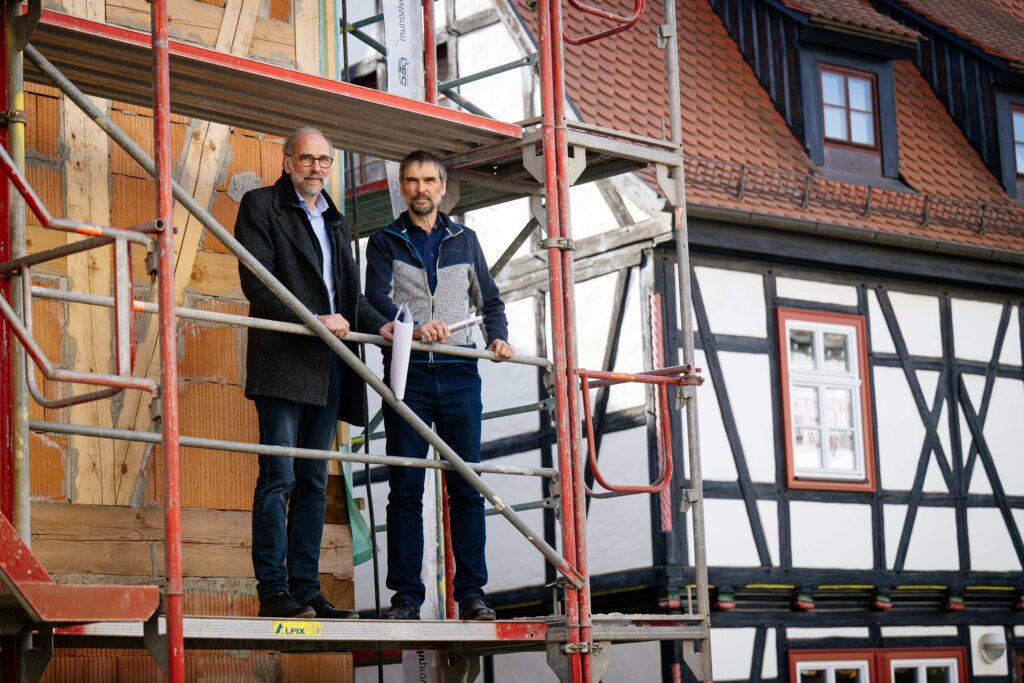 Pappe bauen im Herzen der Erfurter Altstadt ein Fachwerkhaus. Auch wenn das Denkmalschützern anfangs nicht unbedingt gefiel.