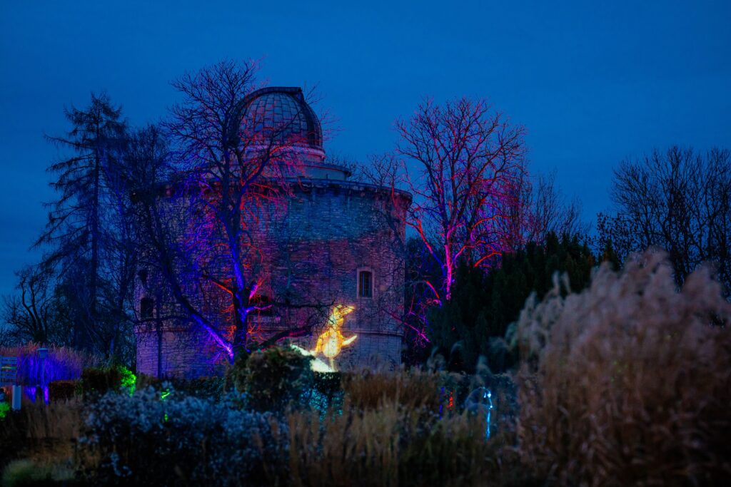 Auf dem Weg zum Rosengarten begegnen Besuchende zahlreichen Lichtgestalten und künstlerischen Figuren, die zwischen Bäumen und Beeten platziert sind. Der bunt beleuchtete Aussichtsturm wirkt wie ein farbenfroher Leuchtturm, der schon von weitem sichtbar ist und dem Gelände eine besondere Dynamik verleiht.