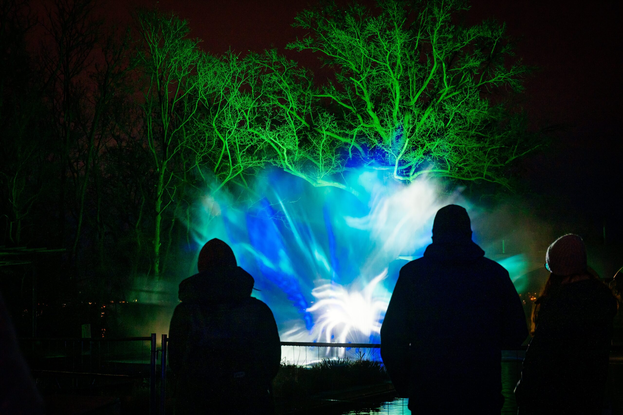 Ein Highlight des Rundgangs ist das Areal rund um das Danakil. Besonders beeindruckend zeigt sich die 10 Meter hohe Wasserfontäne, auf die bewegte Videos projiziert werden. Die Kombination aus Wasser, Licht und Klang schafft ein atmosphärisches Erlebnis mitten im winterlichen Park.