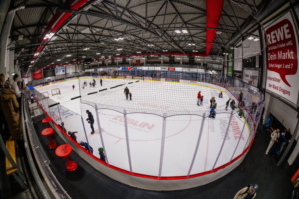 Dach, Lüftung, Beleuchtung, Banden etc. – Kosten: ca. zwei Millionen Euro – wurden sukzessive erneuert. Die TecArt Black Dragons, wie sie nach ihrem Hauptsponsor benannt heißen, steuerten eine neue LED-Anzeigentafel und Umkleidecontainer für die Kindermannschaften bei. Platz ist nun für 1400 Zuschauer. Der Drachen-Durchschnitt liegt bei 950. „Letzte Saison waren unsere damals 1200 Plätze aber fünfmal ausverkauft“, sagt Deutschmann stolz. Was bleibt, sind die ungeklärten, aber fundamentalen Fragen nach neuen Umkleidekabinen für die Heimmannschaft und die nach wie vor nicht vorhandenen Sitzmöglichkeiten. Wer ein Spiel der Black Dragons sehen will, muss seit 1990 Stehvermögen zeigen. Deutschmann kennt aber auch eine große Lösung. Soll heißen, man zieht die Hallenseite an der Arnstädter Straße bis zum Gehweg hinaus und gewinnt Platz für Zuschauertraversen und Funktionsräume. Die Pläne, sagt er, liegen bauantragsreif in der Schublade. Kosten: mindestens 14 Millionen Euro. Illusorisch, dass die Stadt dieses Geld trotz der jahrelangen Vertröstungen und Volten selber bereitstellt. Der EHC-Präsident gibt zu, ein Auge auf die Ankündigung des Bundes zu haben, milliardenschwere Fördergelder in Sportanlagen zu investieren. Wohlwissen, dass das nur Wunschdenken sein kann. Fest eingeplant sind in den nächsten Jahren aber rund drei Millionen Euro u.a. für Umkleidekabinen und Beschallung.