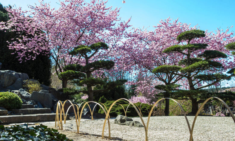 Den Japanische Fels- und Wassergarten zieren Kirschbäume mit weißer und rosafarbener Blütenpracht. Azaleen in…