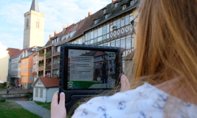 Eric, Madlen, Felicitas und Jost stehen an der Krämerbrücke. Hier gilt es, die Mikwe zu finden. Ausgerüstet mit einem iPad und jeder Menge Spürsinn. Den brauchen sie auch, um die Aufgaben der SWE WissenSWElt zu lösen. Jetzt gibt es neue Fragen in der LernApp – rund um die Bäder und…