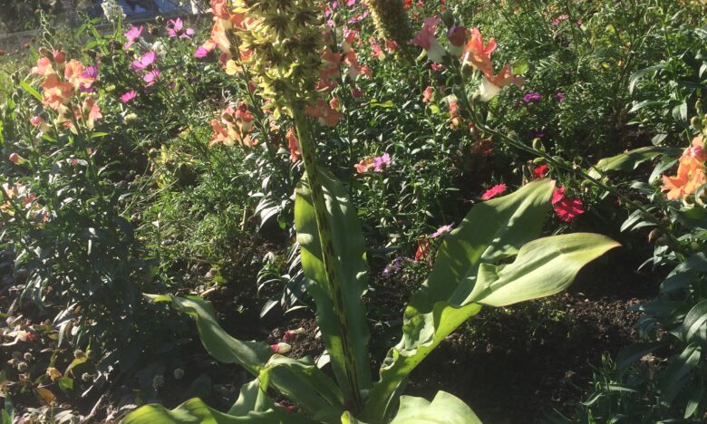 Direkt neben dem großen Blumenbeet, genauer gesagt im Begoniengarten, steht sie, die exotische Eucomis cosmosa, auch Ananasblume oder Gewöhnliche Schopflilie genannt. Obwohl die Eucomis cosmosa auch als Ananasblume bezeichnet wird, hat sie in botanischer Hinsicht aber nichts mit den leckeren Früchten aus dem Süden zu tun.