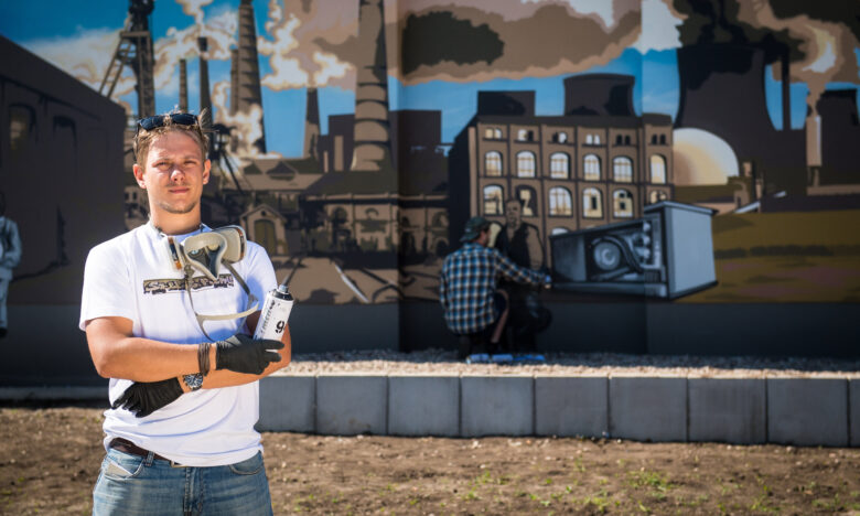 Es ist fertig. Naja fast. Max Kosta sprüht nur noch die letzten Konturen, dann ist das riesige Graffito am Umspannwerk Melchendorf fertig. Ein typisches Graffiti-Werk ist es nicht. Kann es auch nicht, denn Kosta kombiniert gern verschiedene Techniken: moderne und klassische Malerei, Elemente der Kunstgeschichte.